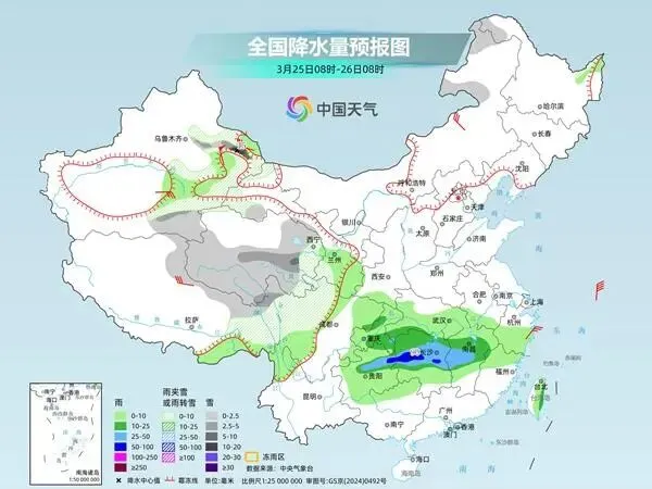 湖南省气象台预计,24日晚短暂间歇后,25日降雨再次发展,湘中以北局地暴雨。