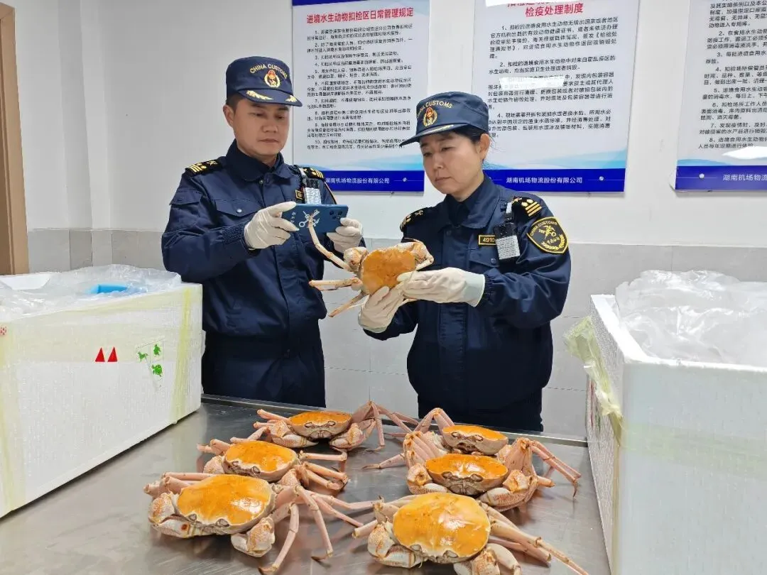 (长沙黄花机场海关关员对进口自肯尼亚的黄金蟹进行现场查验。)