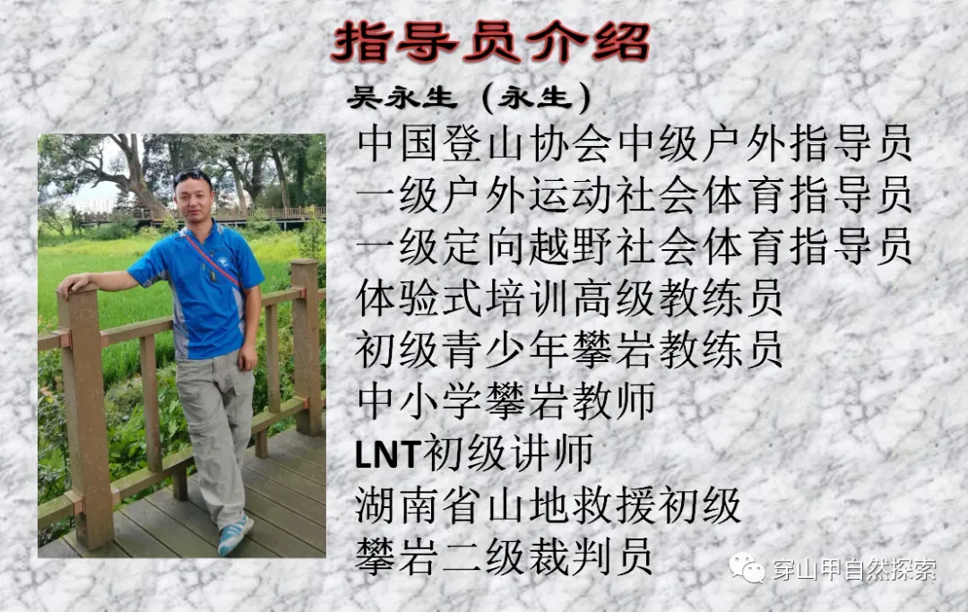 由专业亲子户外成长课程导师,取得相关证书和参与过相关培训(红十字急救员、中国登山协会户外指导员、远足亲子导师、LNT环保讲师等等)。