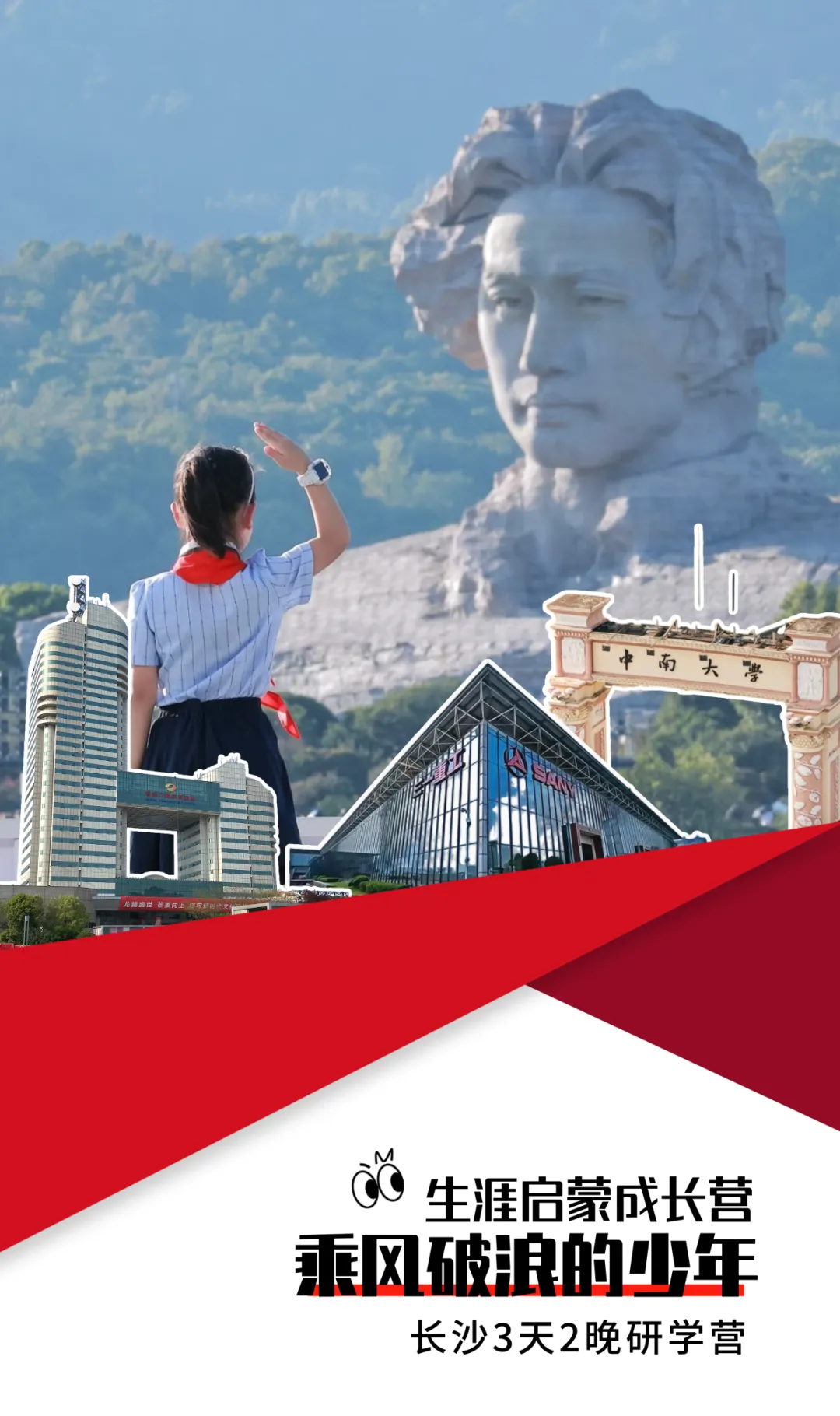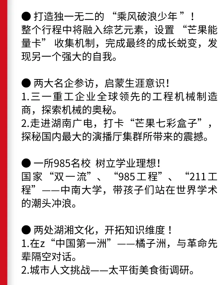 下午:乘坐复古小火车游览长沙城中最大最长的江心洲——橘子洲。【“乘风少年”开营仪式】与革命先辈隔空对话!感悟毛泽东重游橘子洲后写下的“恰同学少年,风华正茂”中的诗意。