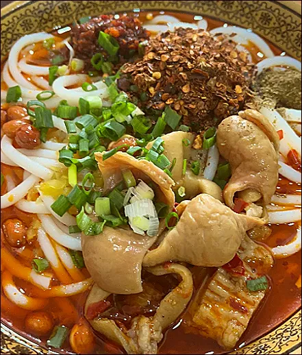 石门的吃,很妙,一边是山野烟火,一边是果香清甜。早晨钻进巷子里,先来一碗肥肠粉,红油亮,香气足,肥肠处理得干净又软糯,一口下去,身子立刻暖过来。那不是单纯的辣,是把人从困意里拽出来的痛快。