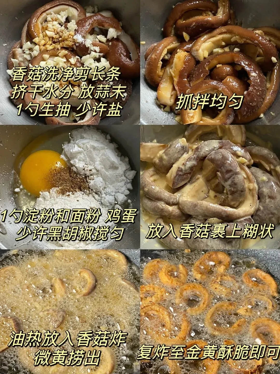 ③姐妹们这步真的超级超级重要,我前两次失败全是栽在这步,第一次炸的时候油温不够放进去直接吸了好多油,吃起来腻的要死,第二次没复炸,放了没十分钟就软了,真的哭死,所以一定要先把油烧到六成热,就是拿筷子放进去冒小泡泡的程度,再把香菇一个个放进去,不要堆一起,炸到表面微黄就捞出来,然后等油温升高到八成热再倒进去复炸个1分钟左右,看到表面金黄金黄的就赶紧捞出来,别炸糊了,这样做出来的香菇放好久都是脆的,咬开里面还能吃到香菇的鲜汁,真的太绝了我跟你们说
