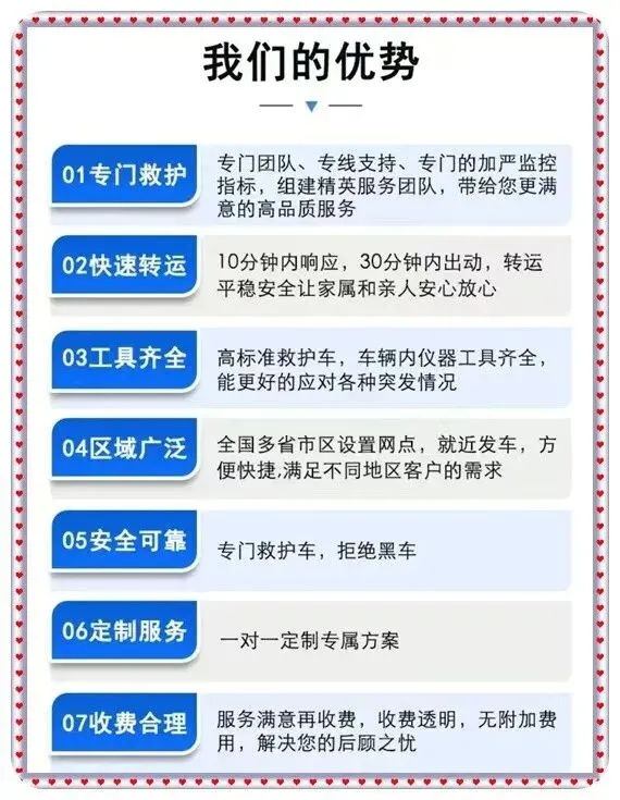 守护生命旅程,我们一直在路上。作为专业的非急救医疗转运服务平台,我们为术后康复、危重患者及异地就医的家庭提供安全、温暖的护送服务。无论是市内转运、跨省返乡、航空医疗护送、香港澳门跨境转运、火车站机场接送,还是境外回国转运,我们都有专业车辆与医护人员相伴。车上配备呼吸机、监护仪、吸氧等设备,给您多一份安心。24小时,随时为您点亮一盏灯。热线:18613127331(微信同号)