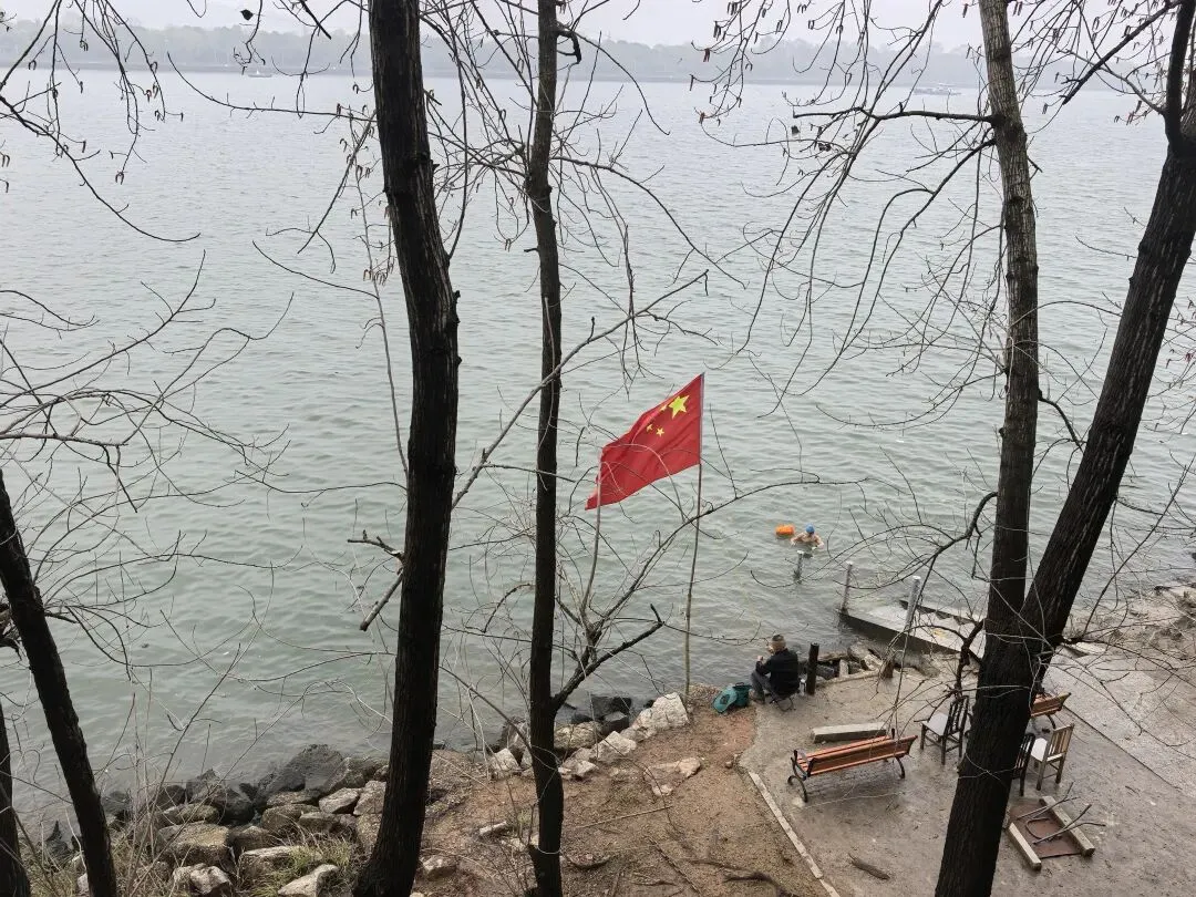 江边有锻炼的人们,老人家站桩练静功,还有推拉练推手的。