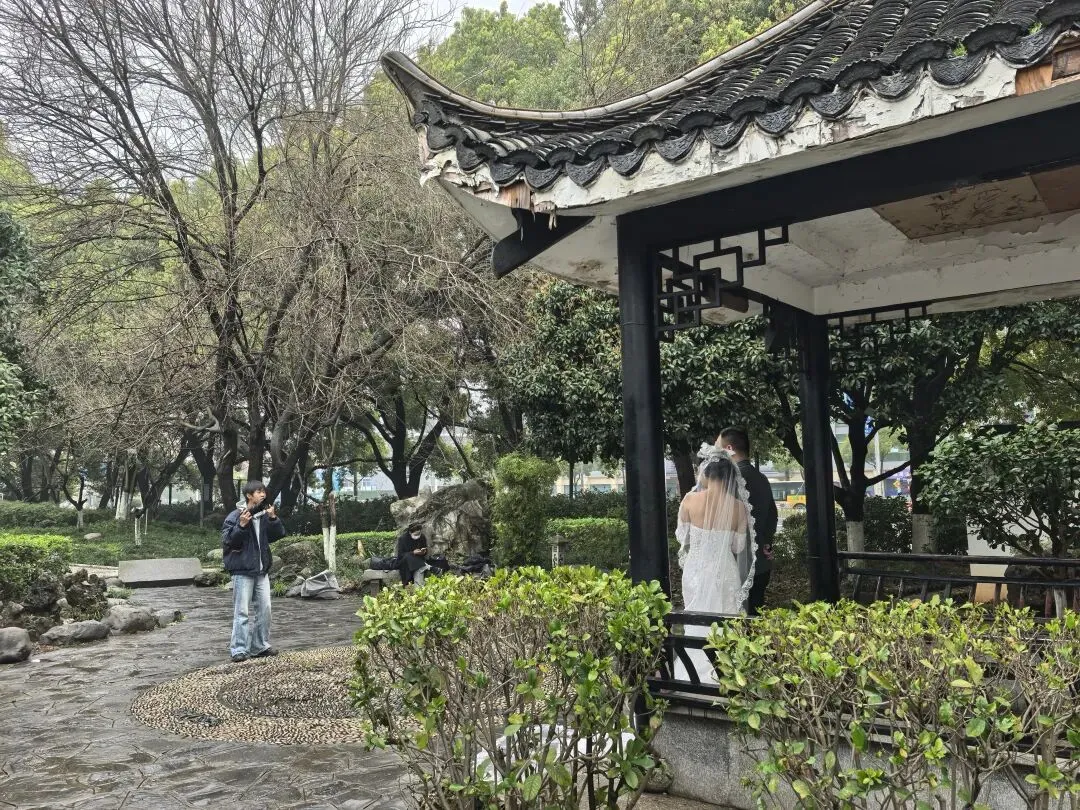 汇芳庭里有拍婚纱照的,新人在人生最美好的时光里的幸福,会无声地传递给过路人。