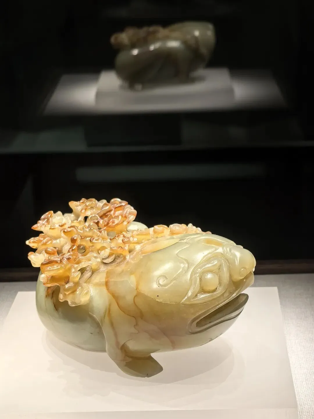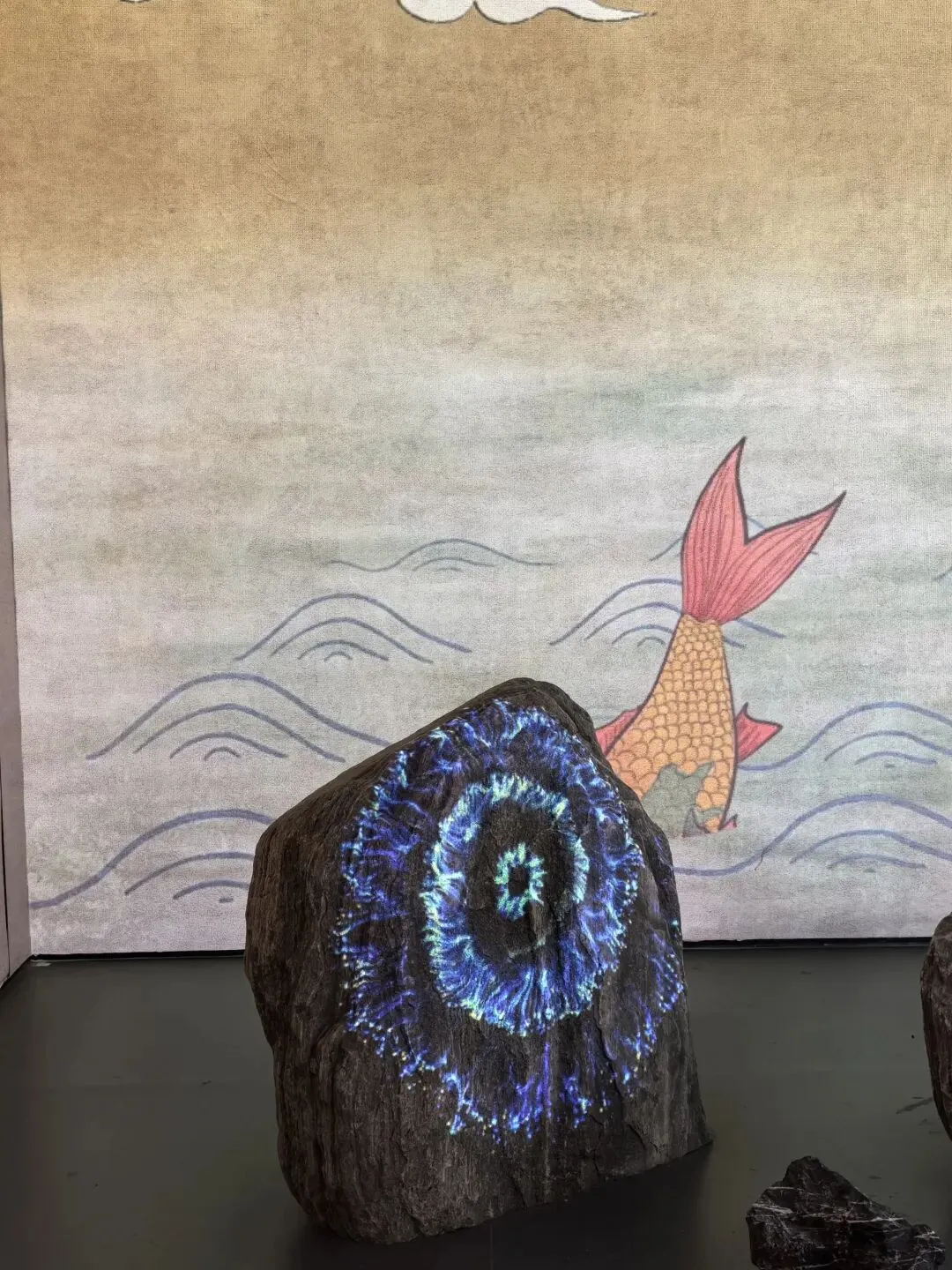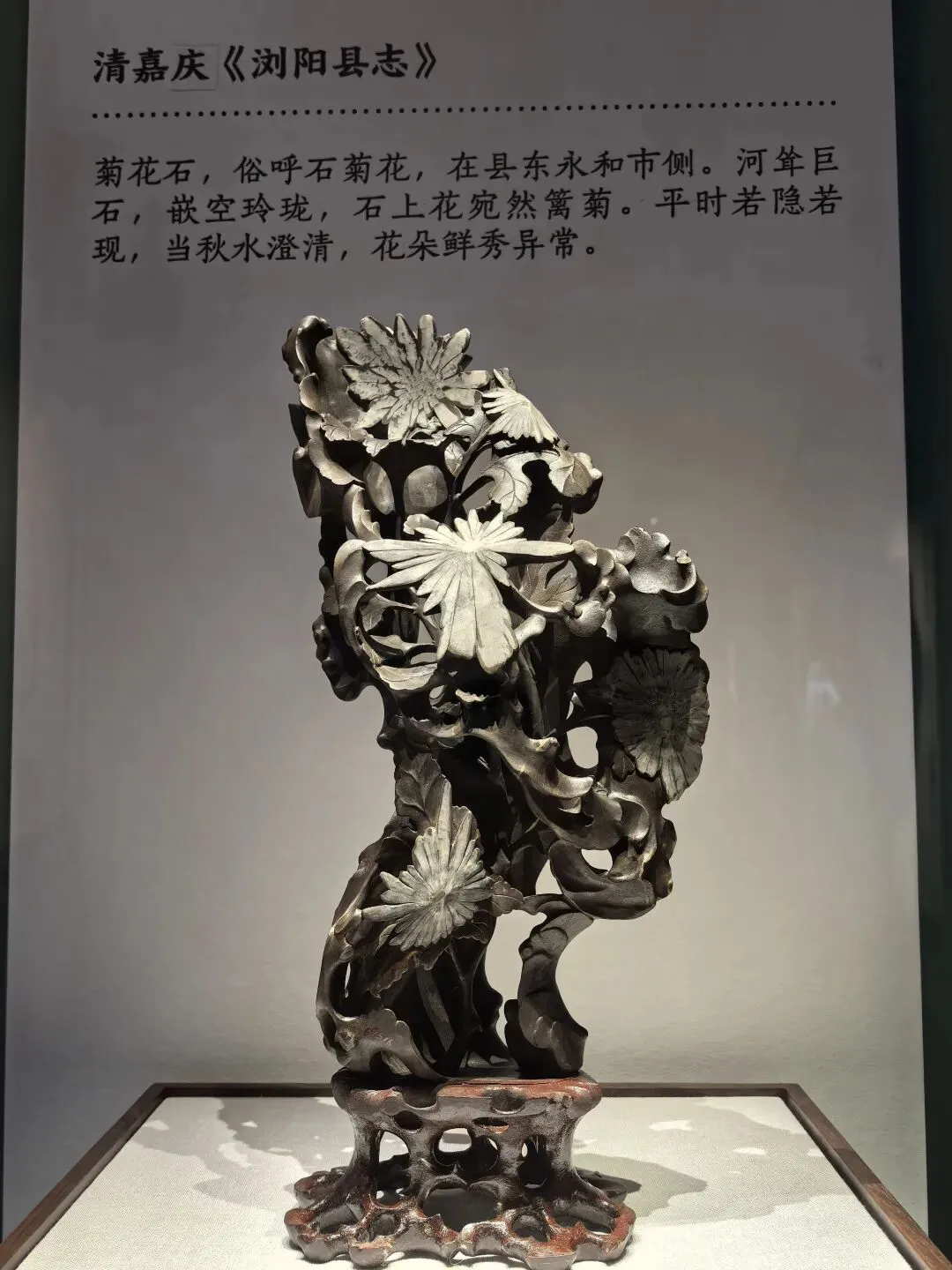 第二部分是院藏石雕精品展。菊花石,俗称石菊花,在永和市河耸巨石,嵌空玲珑,石上花宛然篱菊。平时若隐若现,当秋水澄清,花朵鲜秀异常。