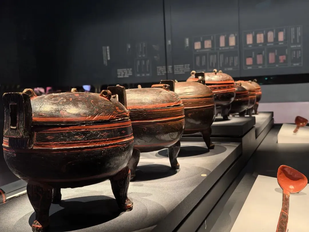 墓中出土240余件漆食具,书有"君幸食"或"君幸酒"铭文,是奉劝墓主进食、酒的敬语。墓主生前饮食考究, 其食品之丰、食法之精、食器之美,无不大盛于前,再现了轪侯家美食配美器的精致生活。