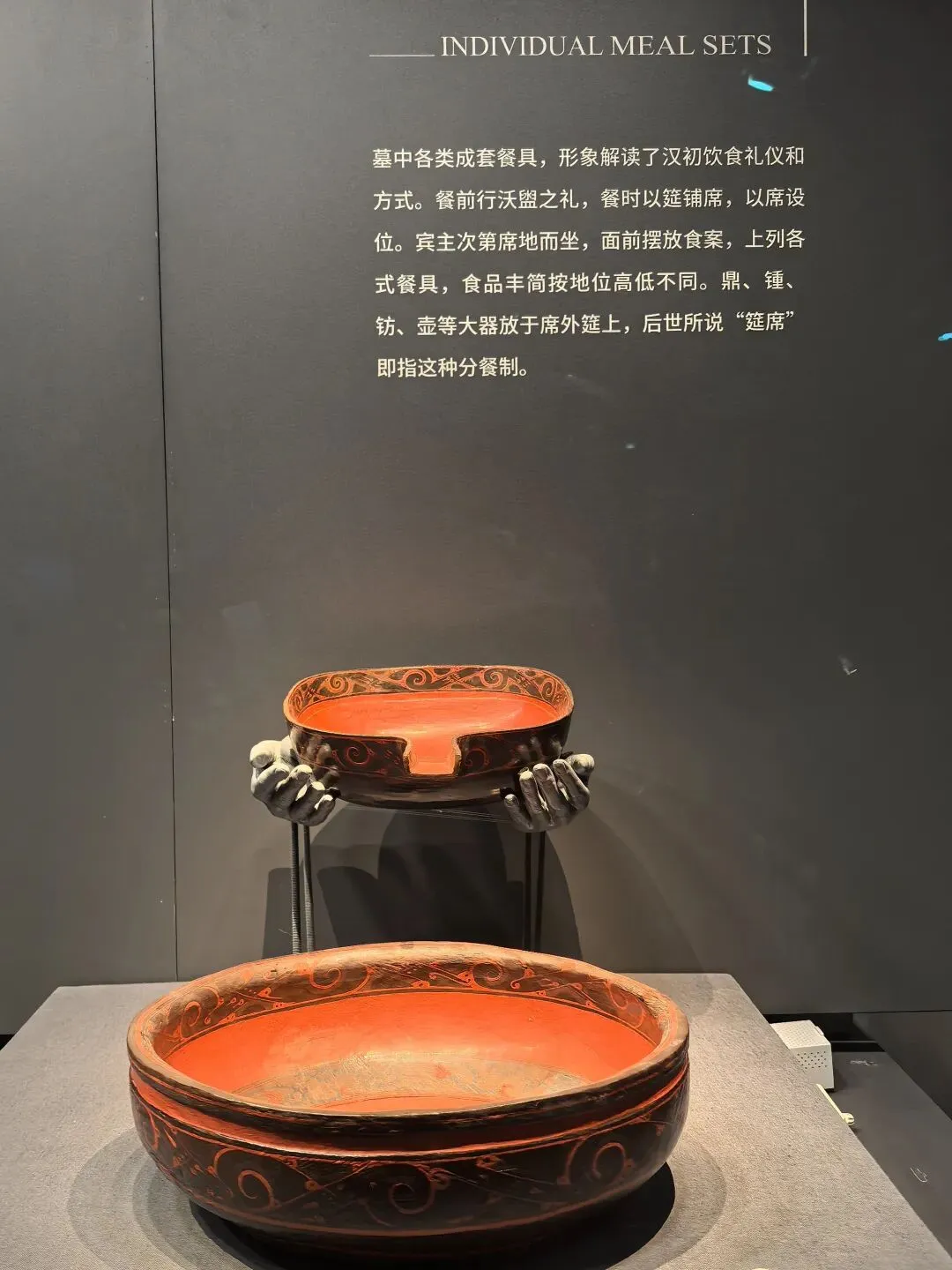 墓中各类成套餐具,形象解读了汉初饮食礼仪和方式。餐前行沃盥之礼,餐时以筵铺席,以席设位。宾主次第席地而坐,面前摆放食案,上列各式餐具,食品丰简按地位高低不同。鼎、锺、钫、壶等大器放于席外筵上,后世所说"筵席"即指这种分餐制。