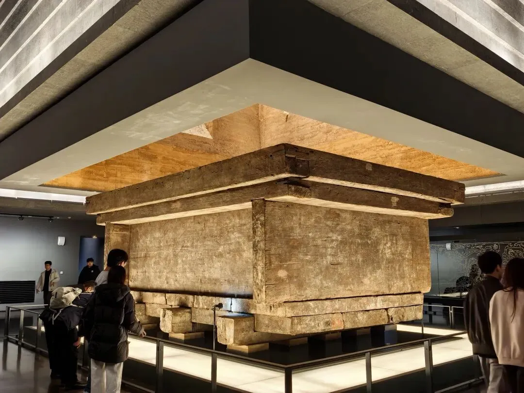 超巨大的辛追墓外椁。原置于墓底三根方形枕木上,有盖板两层、顶板一层和底板两层。模仿生前居室的椁室,由棺室与四个边厢组成,形状像"井"字,古文献称为"井椁" 边厢 放置随葬品1000多件。棺室内有四层套棺。整椁 重1.5吨。这是迄今保存最大、最完整的汉代井椁实物。