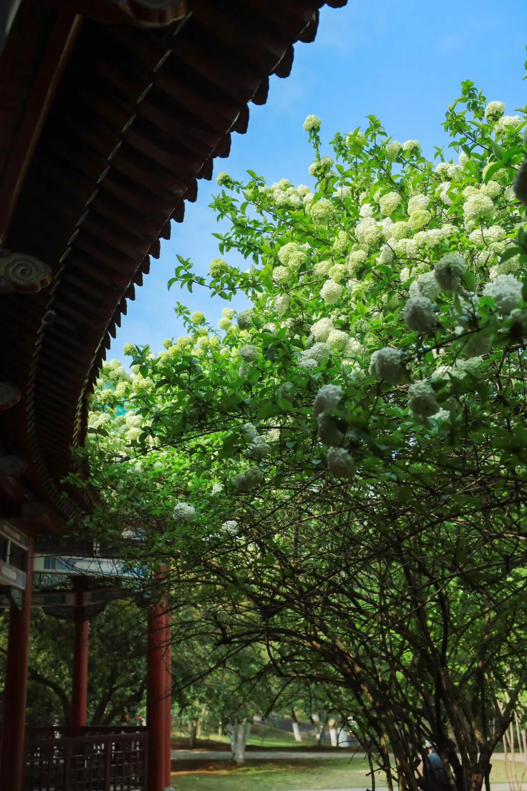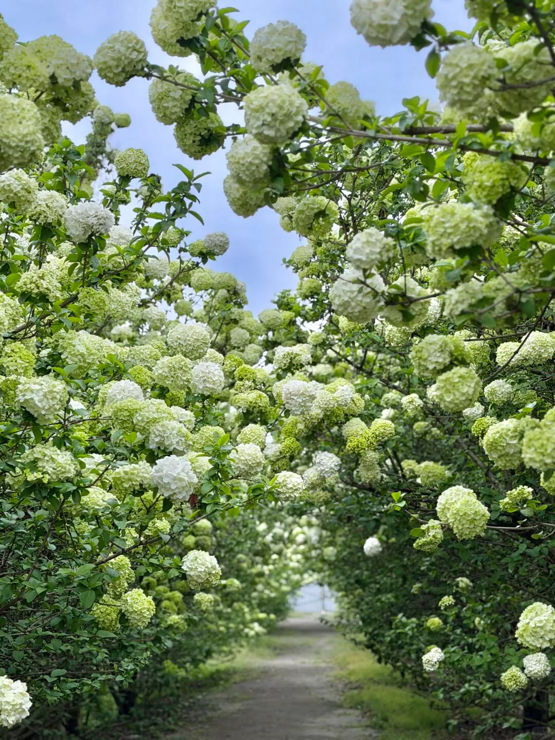 最绝的是这里的木绣球长得特别密集,花球挨在一起,不用找角度,往树下一站就被花海包围,清透感拉满。