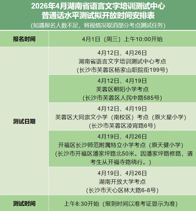3. 为满足社会考生报考需求,我中心现设有五个考点(湖南省语言文字培训测试中心考点、长沙市芙蓉区朝阳小学考点、长沙市芙蓉区大同崇文小学(南校区)考点、长沙市开福区长沙师范附属特立小学考点、湖南开放大学考点),请考生报名时注意区分五个考点地址,测试地点以最终打印准考证上显示为准。
