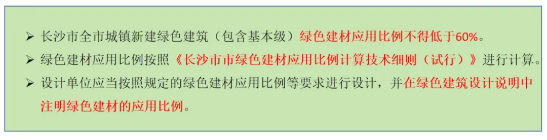 ²长沙市绿色建筑采用绿色建材最低要求需达到 60%;