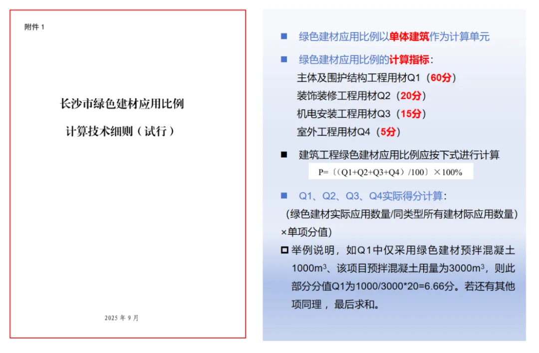 ²长沙项目绿色建材应用比例核算以单体建筑为计算单元,需依据《长沙市绿色建材应用比例计算细则(试行)》,围绕主体及围护结构工程用材(Q1)、装饰装修工程用材(Q2)、机电安装工程用材(Q3)、室外工程用材(Q4)四大类、合计 51 项二级指标统一统计计算;