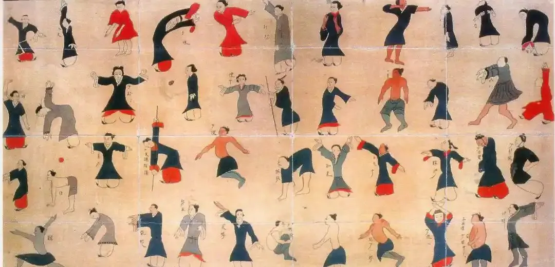 1973年长沙马王堆三号汉墓出土的《导引图》是中国最早的“体操图式”,也是中国最早的中医保健图。图中绘有各种运动姿势的帛画44幅,创造了一套以呼吸运动与躯体运动相结合的医疗体育方法,谓之“导引”,故称《导引图》。
