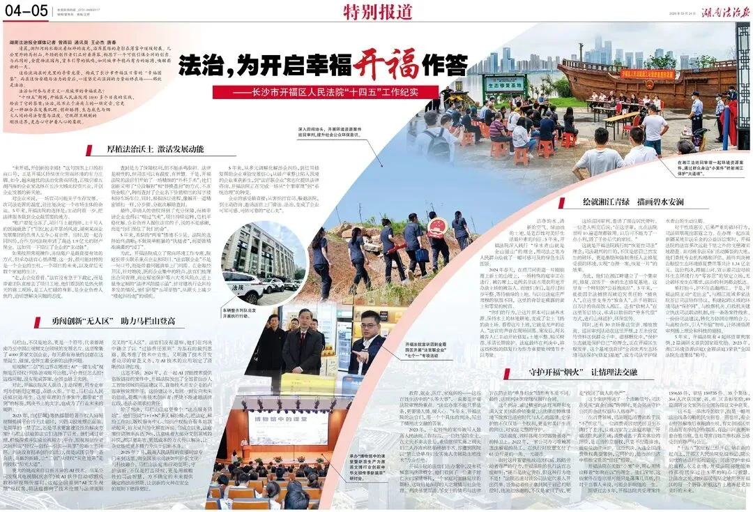 “十四五”期间,开福区人民法院用1800多个日夜的实践,给出了它的答案:法治,远不止于法庭上的一槌定音,它更是一种融合在发展肌理、创新脉搏、生态底色与烟火人间的司法智慧与温度。它既捍卫规则的刚性边界,更悉心守护着人心的柔软。