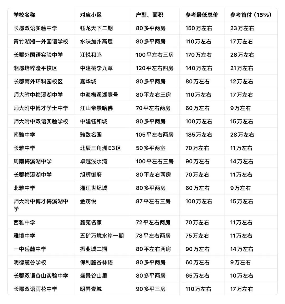 • 长郡双语实验中学:总价150万起,首付23万