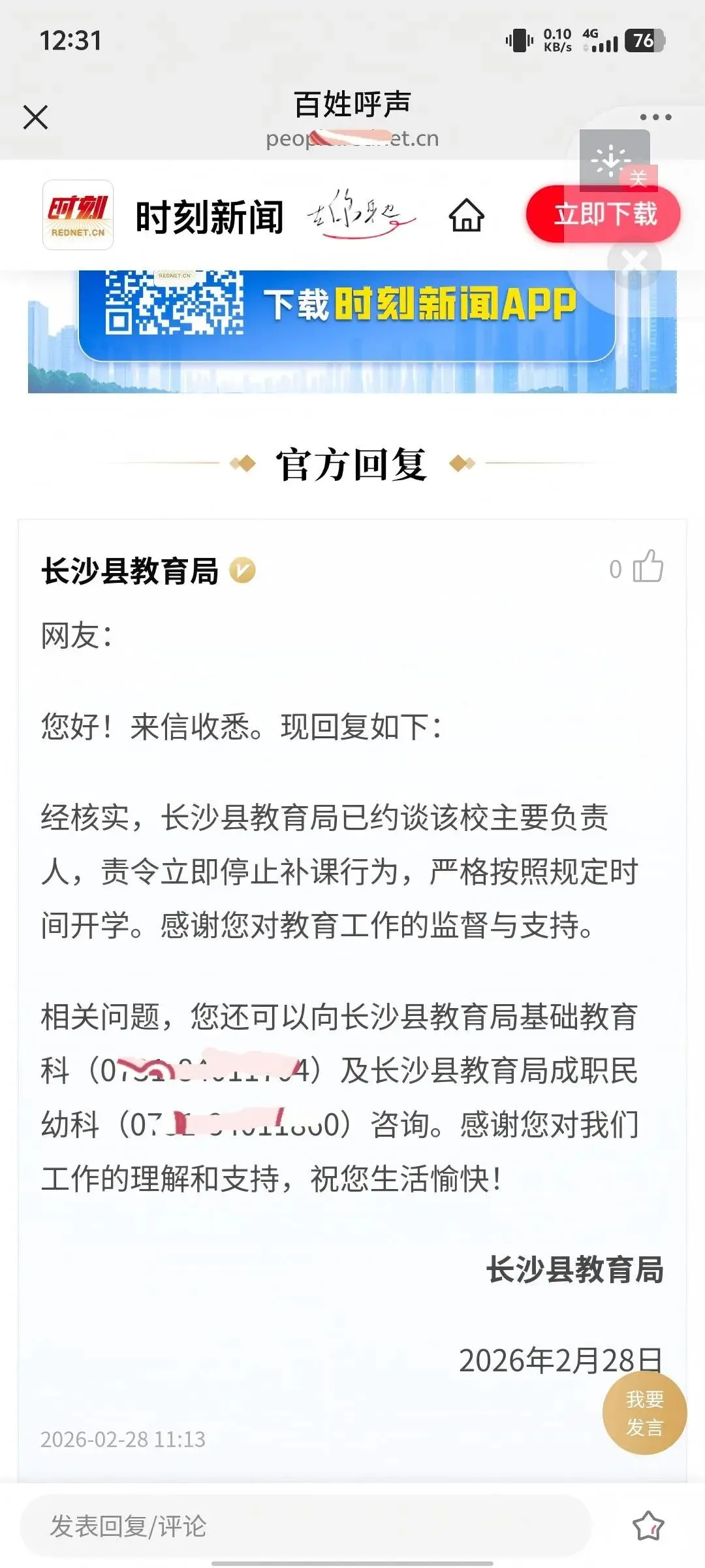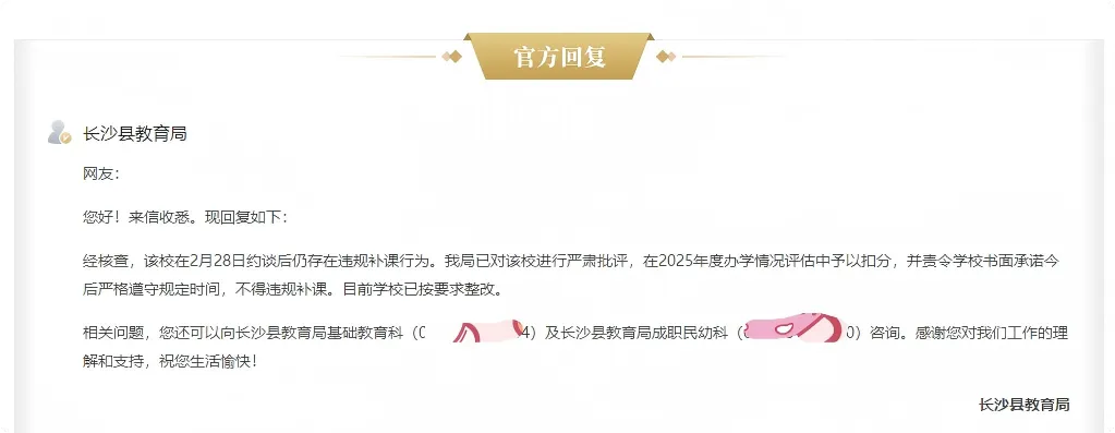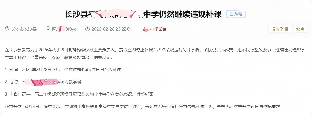 长沙一高中被投诉整改后仍违规补课,教育局:严肃批评,已按要求整改