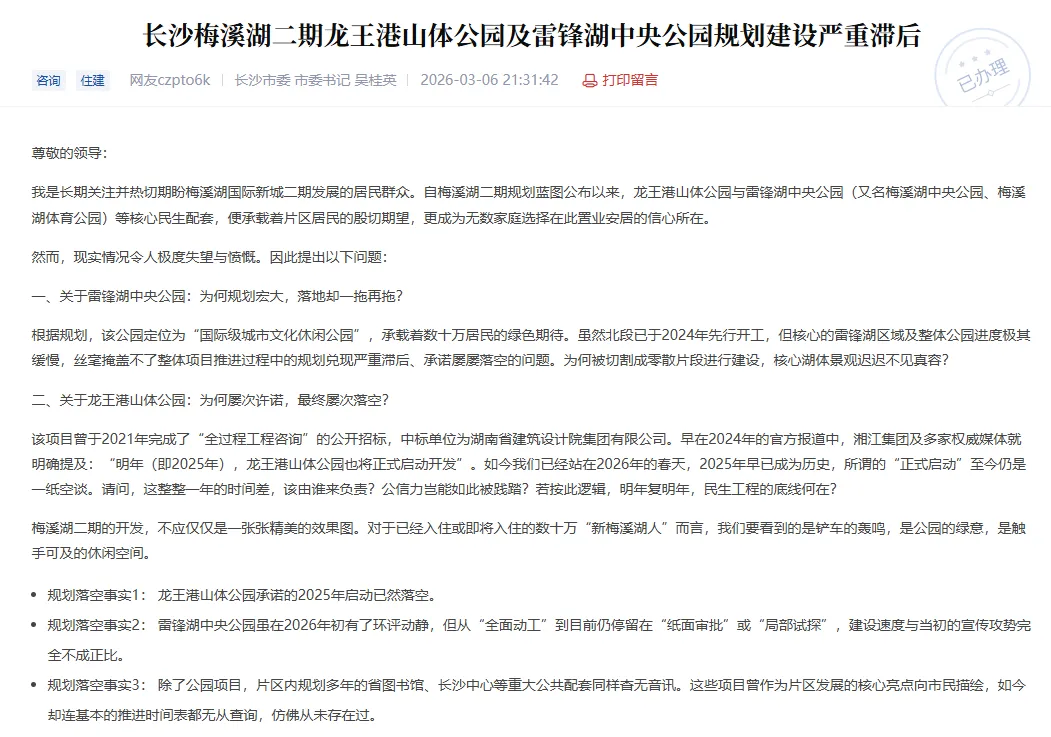 近日,有网友在问政湖南平台发文,询问梅溪湖二期龙王港山体公园以及雷锋湖中央公园何时开工建设。
