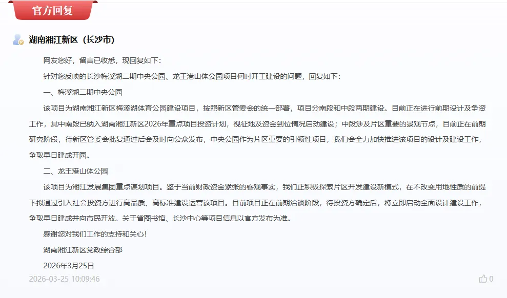 对此,3月25日,湖南湘江新区党政综合部回复道: