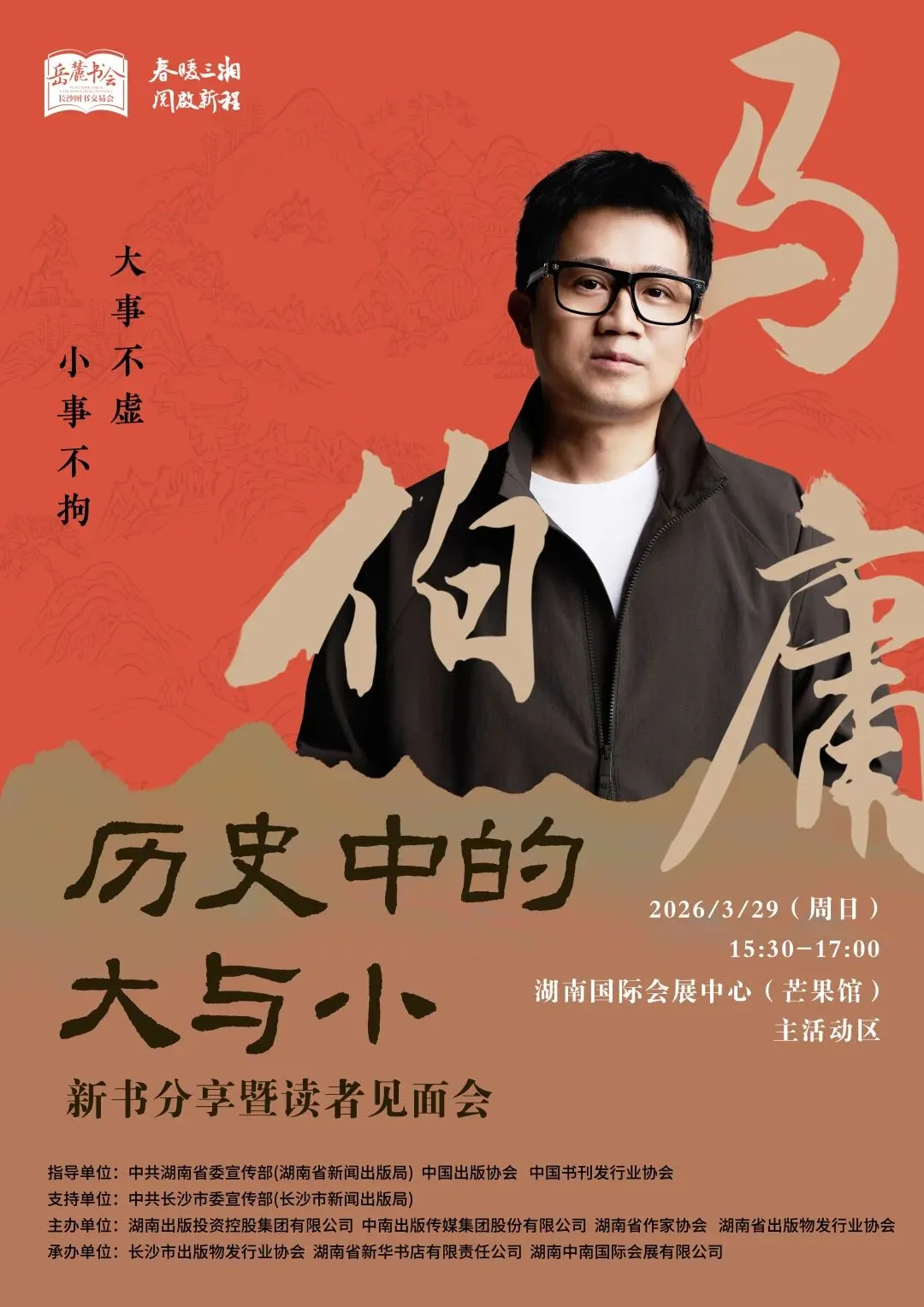 作为本届岳麓书会的重磅活动,知名作家马伯庸将携其全新历史随笔集《历史中的大与小》来到长沙精彩开讲,在湖南女子学院、不吝书店、湖南国际会展中心主会场连续举办三场新书读者见面会。