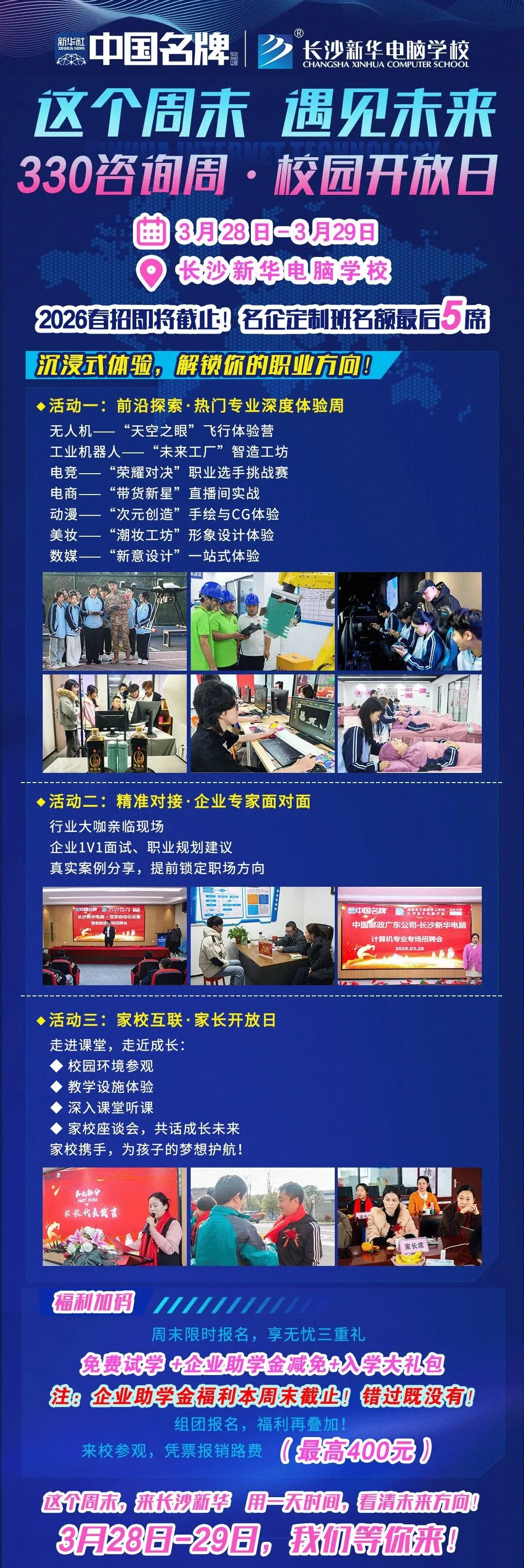 别担心,新华每年的“330专场职教咨询周活动”来啦!在这个充满机遇与挑战的时代,职业教育正迎来前所未有的发展黄金期 !我们围绕学生、家长比较关心的专业、升学、就业、学生管理等方面的热点问题,以“线上线下相结合”的模式,为广大家长、学生提供一对一答疑解惑,规划未来蓝图!