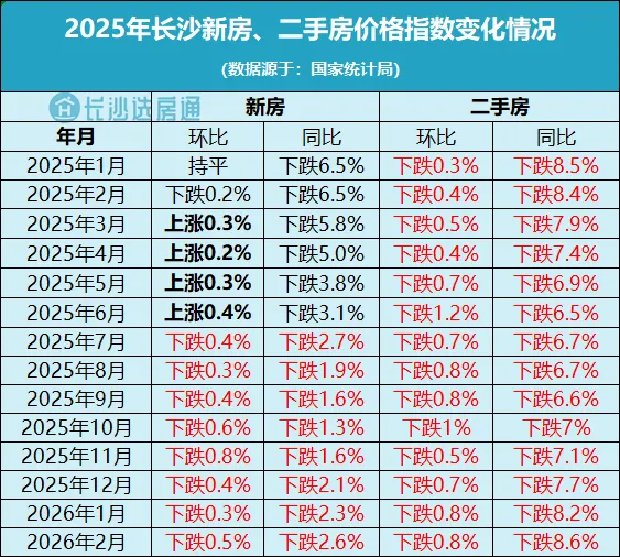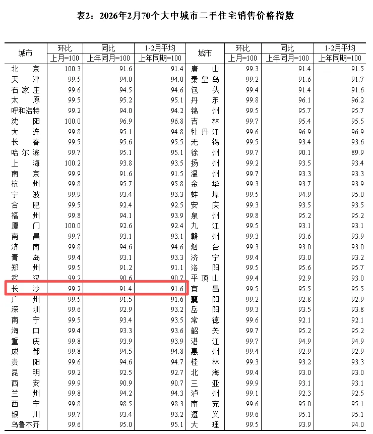 3月16日,国家统计局发布了2026年2月份商品住宅销售价格变动情况统计数据。数据显示,长沙二手房价格指数环比下跌0.8%,同比下跌8.6%。