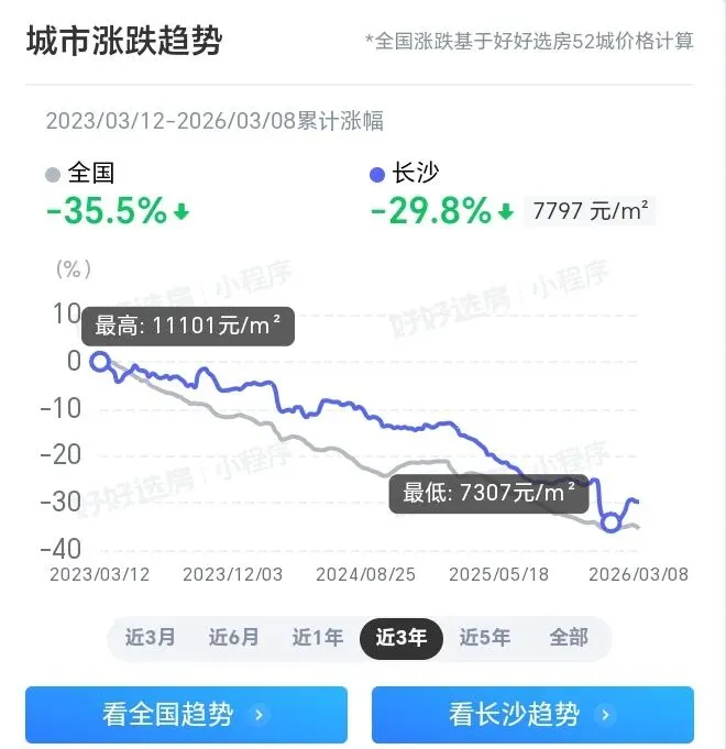 虽然成交量不低,但价格却是跌跌不休,长沙二手房成交均价已经从2023年的10543元/㎡跌至2025年的8022元/㎡,时至2026年,长沙二手房成交均价已跌至“7字头”……