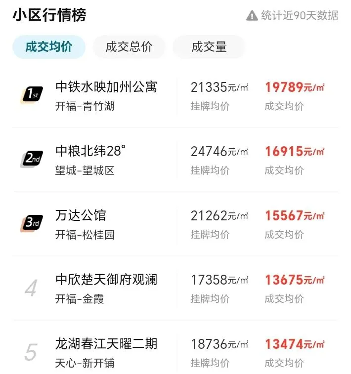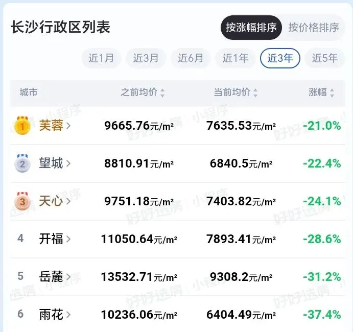 其中雨花区跌幅较大,从三年前的10236元/㎡跌至6404.49元/㎡,跌幅达37.4%,岳麓区跌幅同样不小,成交均价跌幅超30%。芙蓉区相对较稳,跌幅为21%。(注:数据仅供参考)