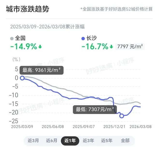 从近一年情况来看,当前长沙二手房成交价格为7797元/㎡,跌幅达16.7%,略高于全国52城平均水平。目前长沙二手房下行趋势尚未根本性扭转,价格仍在筑底阶段。