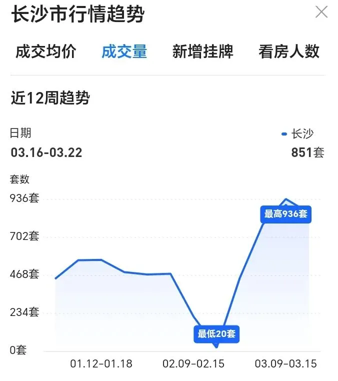 3月第一周,长沙二手房周成交779套,第二周成交936套,第三周成交851套,单日最高成交224套,仅三周时间成交超过2500套。若叠加其他平台,数据有增无减。