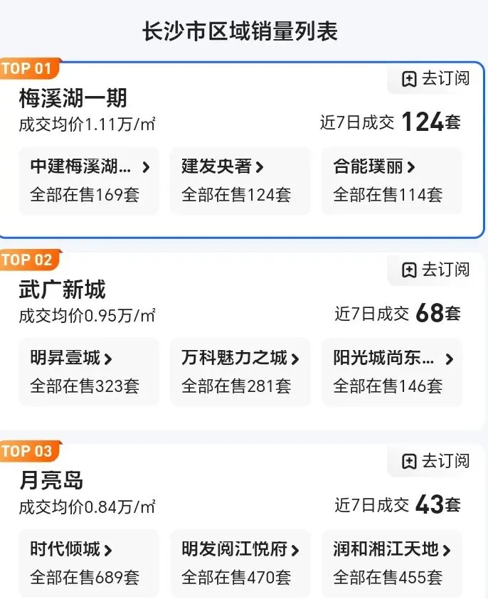 从板块热度及成交价格来看,核心区域与远郊板块的分化持续加剧:梅溪湖、滨江等优质板块凭借教育配套与交通便利性,价格韧性相对较强,部分品质楼盘成交价仍能维持在1.2万元/㎡以上;而望城、星沙等外围区域,由于配套兑现周期长、新房供应充足,二手房价格已普遍回落至6000至8000元/㎡区间。
