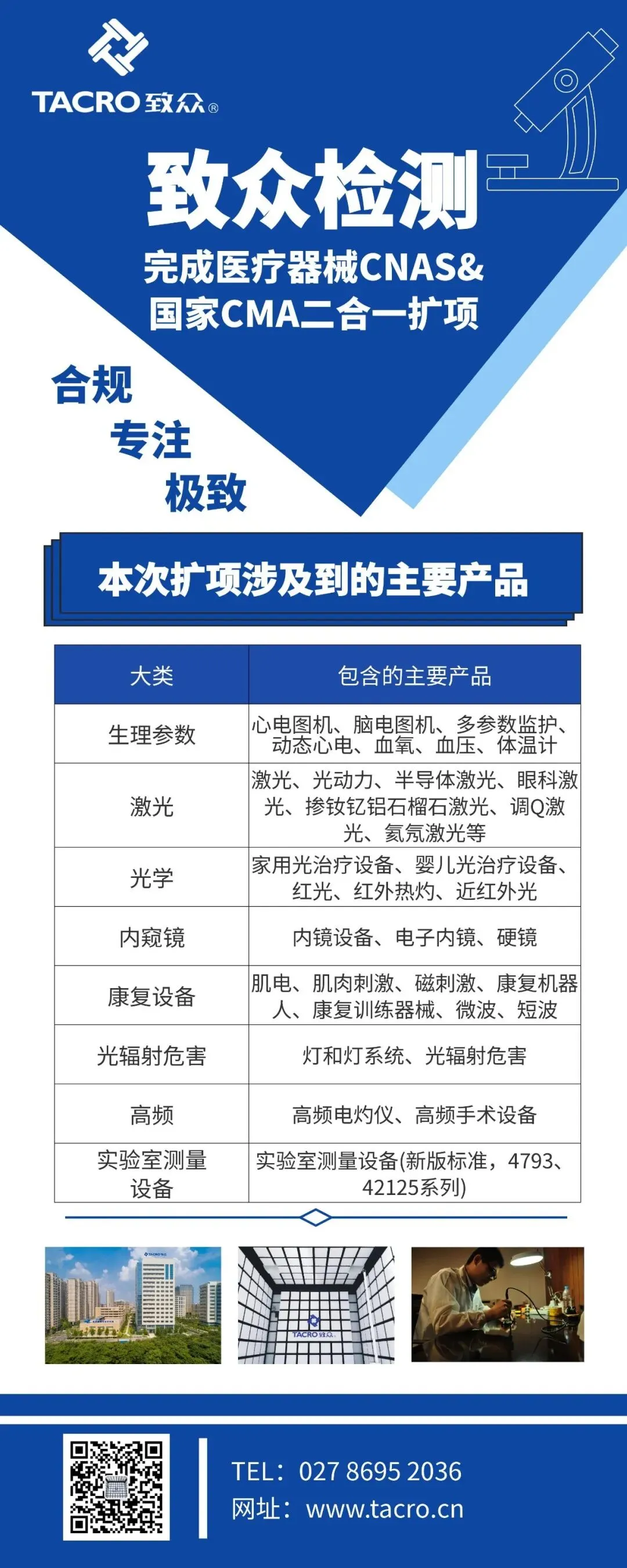 致众检测使用面积约2500平方米,坐落于武汉软件新城,是致众科技集团照国际标准ISO 17025要求、CNAS-CL01准则建⽴的综合性医疗器械检验机构,旨在建设具有国内先进技术水平和优质服务的医疗器械检验及研发实验室。研究院一期工程建立了电磁兼容、安规、环境及可靠性、微⽣物检测、包装验证等五大功能实验室,可提供完整优质的委托检测与技术培训服务。