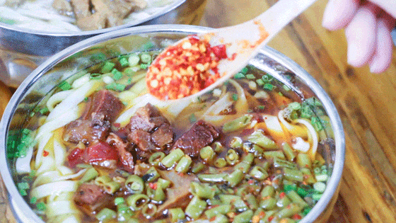 他家用的是那种宽粉,加入十几种调料,最后淋上一勺猪油,撒上葱花。老板每天早起现切粉,手工做的,每天限量200碗,卖完就回家。