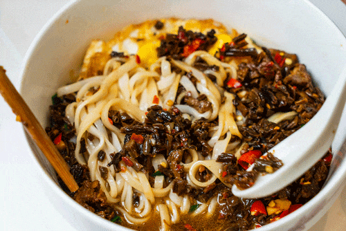 招牌就是那个椒脆粉,里面的码子有牛肉和鱿鱼。汤头喝起来有点甜甜的,配上火辣辣的椒脆,一碗粉很快就见底了,很多人甚至要连吃两碗才过瘾。