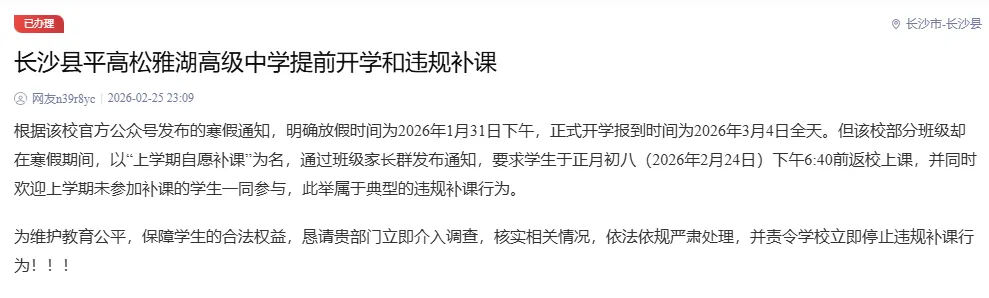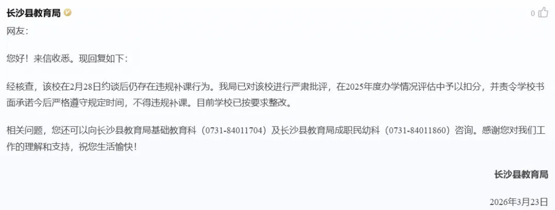 近日,某网友在长沙的红网“百姓呼声”平台上4天内连续两次投诉长沙县一高中违规补课。这位网友称该校负责人被长沙县教育局约谈之后,仍顶风作案、拒不执行整改要求,继续违规组织高一、高二年级部分班级开展语数英物化生等学科集体授课、讲授新课。该网友认为,该校违规组织学生集中补课,严重违反“双减”政策及教育部门相关规定。请有关部门立即对平高松雅湖高级中学再次进行核查,责令其无条件停止所有违规补课行为,严格执行法定开学时间与作息要求。对此长沙县教育局在最新的留言中回复:经核查,该校在2月28日约谈后仍存在违规补课行为。我局已对该校进行严肃批评,在2025年度办学情况评估中予以扣分,并责令学校书面承诺今后严格遵守规定时间,不得违规补课。目前学校已按要求整改。"双减" 政策自实施以来,一直是规范教育教学行为的硬约束。教育部明确规定,严禁在双休日、法定节假日及寒暑假组织任何形式的集体补课或变相学科培训。长沙市2026年春季中小学收费政策也明确划定红线,严禁中小学补课乱收费、违规组织集体补课,民办学校与公办学校同等遵守国家教育法规。