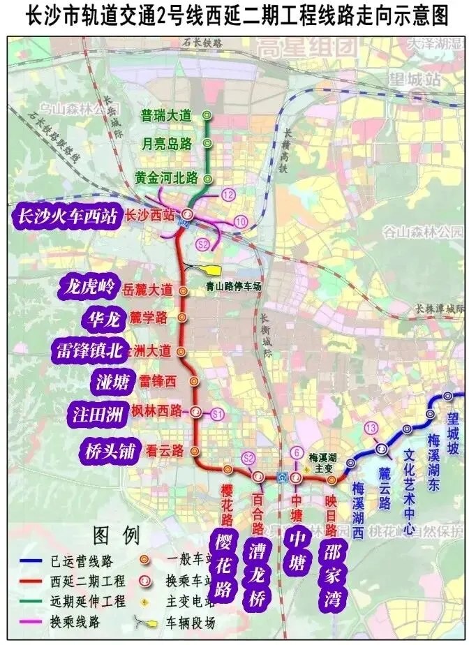 重要意义:通车后,2号线将成为连接长沙三大铁路枢纽(长沙站、长沙南站、长沙西站)的“超级大动脉”,极大地便利了河西居民出行和高铁西站的客流集散。不过,由于长沙西站仍在建设中,西站站和邵家湾站可能会暂缓开通。