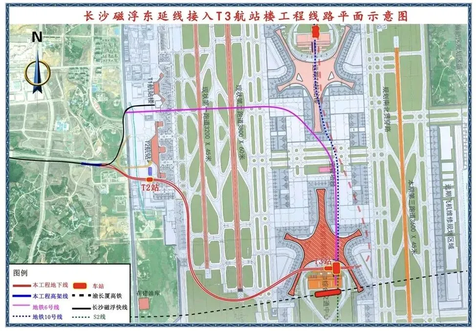 线路走向:从现有的磁浮高铁站出发,接入新建的黄花机场T3航站楼。