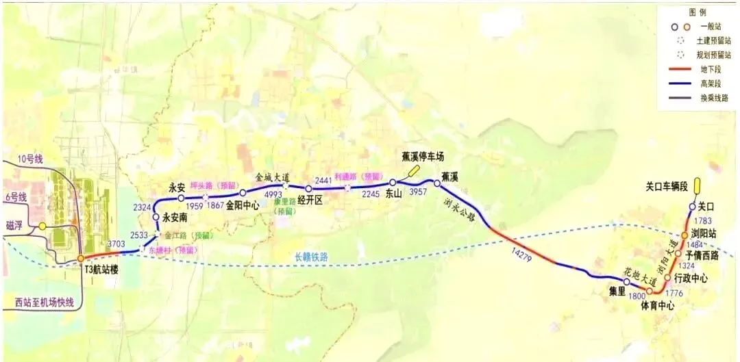 线路走向:从已运营的黄花机场T1T2站出发,向东延伸至新建的黄花机场T3站。
