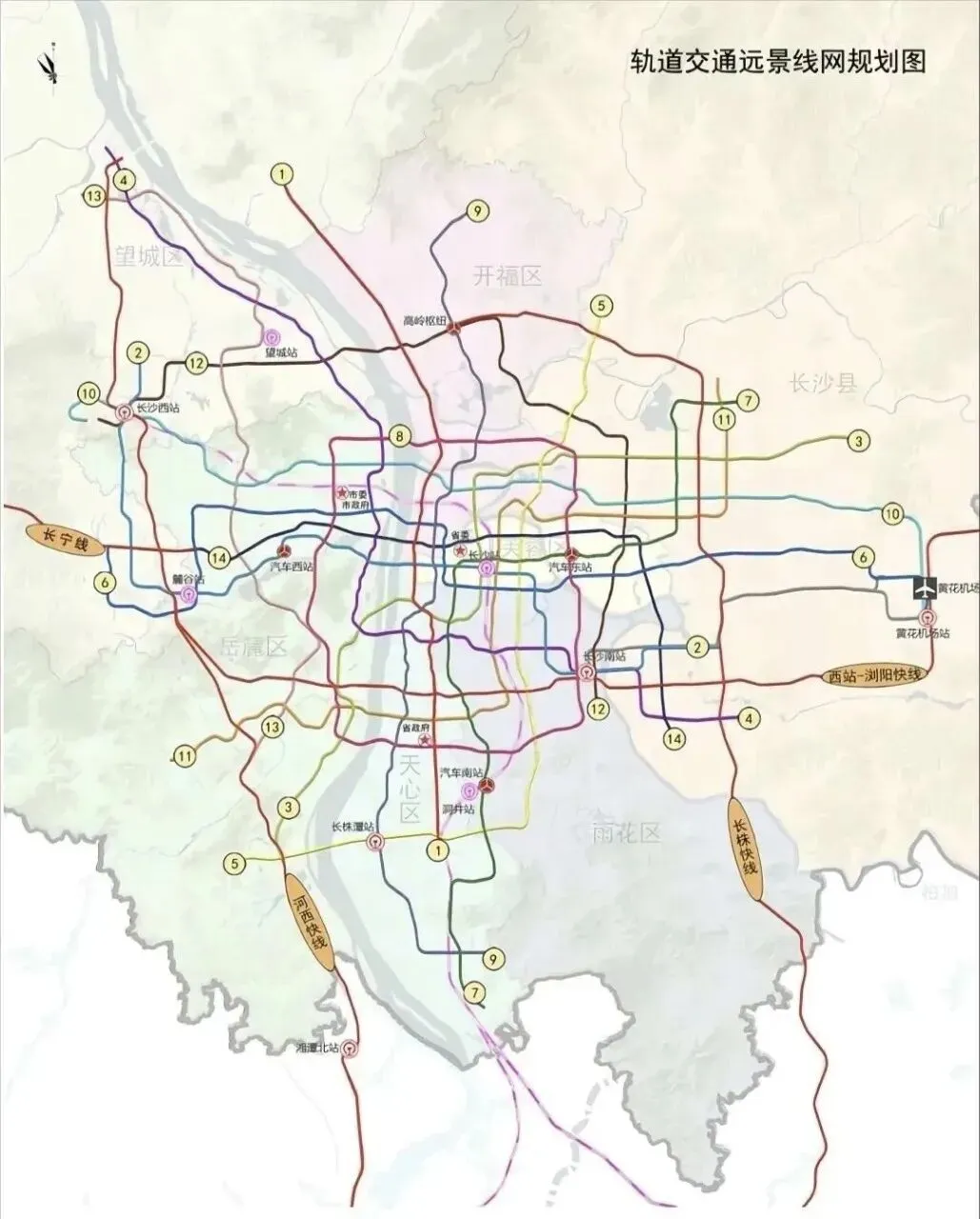 线路走向:从大托铺站继续向西延伸,预留衔接湘江科学城的通道。