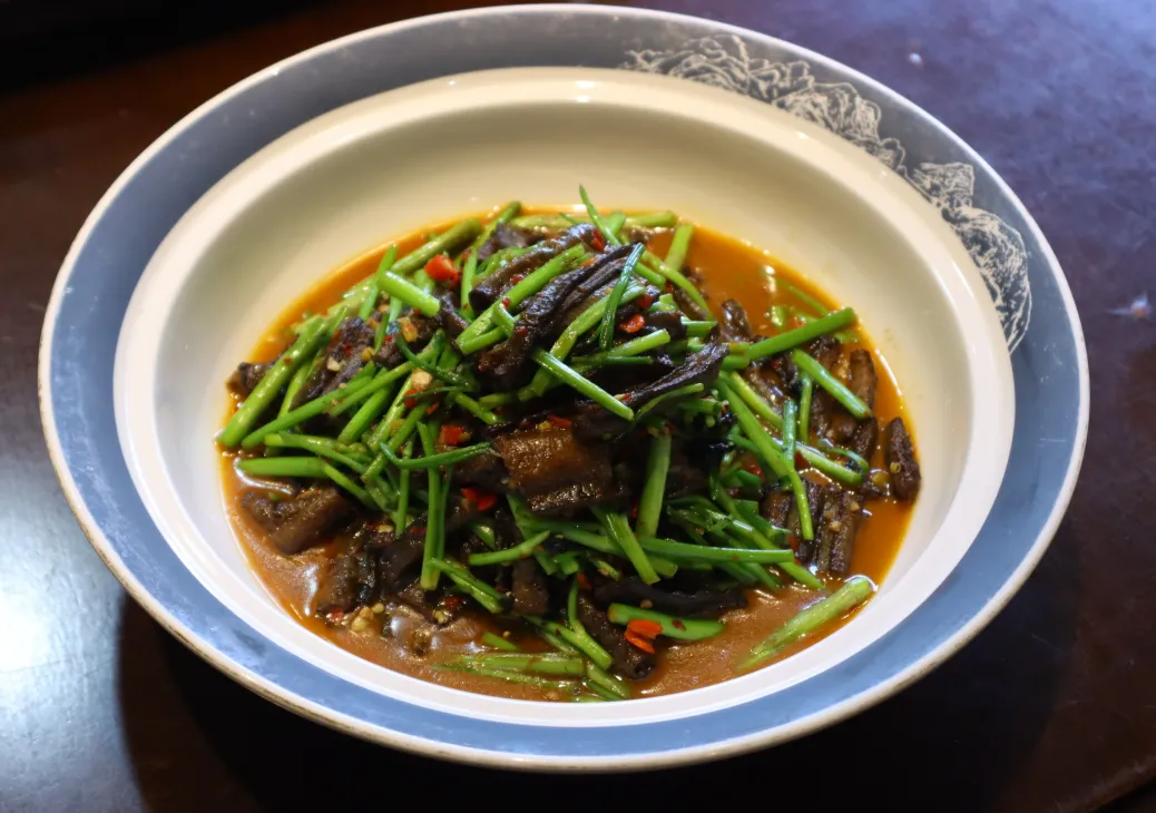 其次,这些“老三样”,是湖南人用几十甚至上百年验证的“最佳搭配”。藜蒿炒腊肉,腊肉的油脂浸润藜蒿的脆嫩,中和了腊肉的油腻,这是恰到好处的组合;水芹菜清炒,放几粒豆豉,脆嫩爽口,自带薄荷般的清凉,解腻又开胃;春笋清淡,必须用风吹肉的咸鲜赋予它味道。