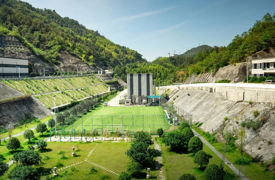往大坝下看,U型山谷中,还打造了一个天然的绿色运动场。「当时,我们前期调研的时候,厂区工作人员就提出,看能否预留建设出一个足球场,丰富值班员工的业余生活。」