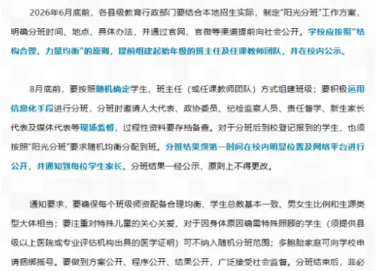 湖南省教育厅发布重磅通知,自2026年秋季学期起,全省义务教育起始年级全面实施“阳光分班”。政策核心在于严禁设立重点班、快慢班、实验班,严禁通过入学考试分班。分班将采用信息化手段随机匹配学生与教师团队,确保师资、生源均衡,并邀请多方代表现场监督,结果公示后原则上不得更改。