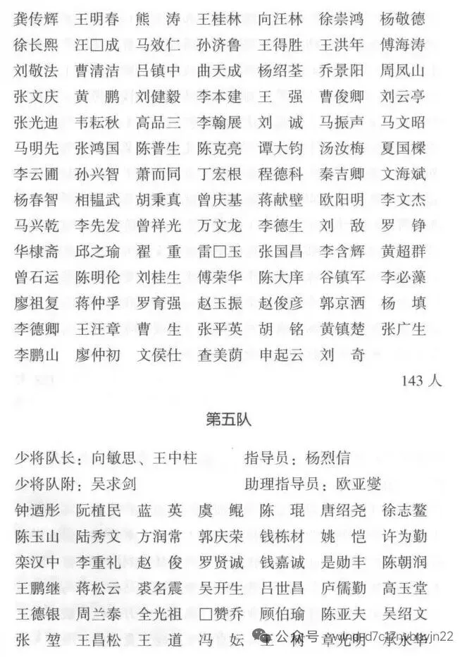第五队学员137人。队长向敏思为第18军14师42旅少将旅长,少将队长王中柱为第14师40旅少将旅长。队附吴求剑也是少将,指导员杨烈信为军委会政治部战干1团中校指导员。下设3个区队,由第195师229团(?)上校团长钟形、第14师40旅中校参谋阮植民、军校特训班中校中队长蓝英分别任区队长。该队学员来源比较广泛,除部队现役军人90余名外,还有红十字会救护队员19人,战干1团、3团等单位招录的青年学生20余人。