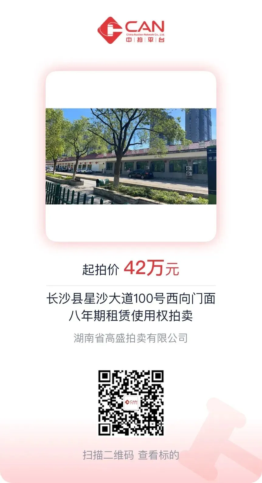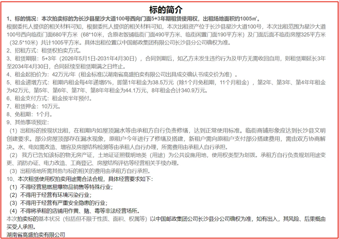拍卖标的:长沙县星沙大道100号西向门面5+3年期租赁使用权,出租场地面积约1005㎡。根据委托人提供的相关材料可知,本次出租资产位于长沙县星沙大道100号,本次出租范围为星沙大道100号西向临街门面680平方米(68*10米,含原老饭铺临街门面490平方米、临街闲置门面190平方米)及门面后面不临街房屋325平方米(32.5*10米)共计1005平方米。具体出租位置以中国邮政集团公司长沙县分公司确权为准。