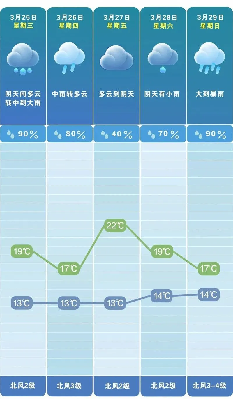 根据市气象台预报,25日阴天间多云转中到大雨,降水概率高达90%,气温13℃至19℃;26日中雨转多云,降水概率80%,气温13℃至17℃。这两天出门,雨伞是标配,路上湿滑,开车尤其要慢行。