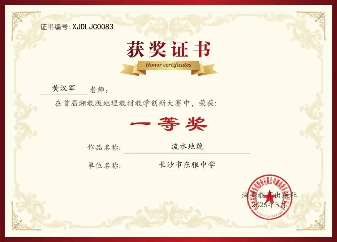 春风传喜讯,硕果满雅园。近日,首届湘教版地理教材教学创新大赛评选结果公布,长沙市东雅中学党委书记黄汉军作品《流水地貌》荣获大赛一等奖。