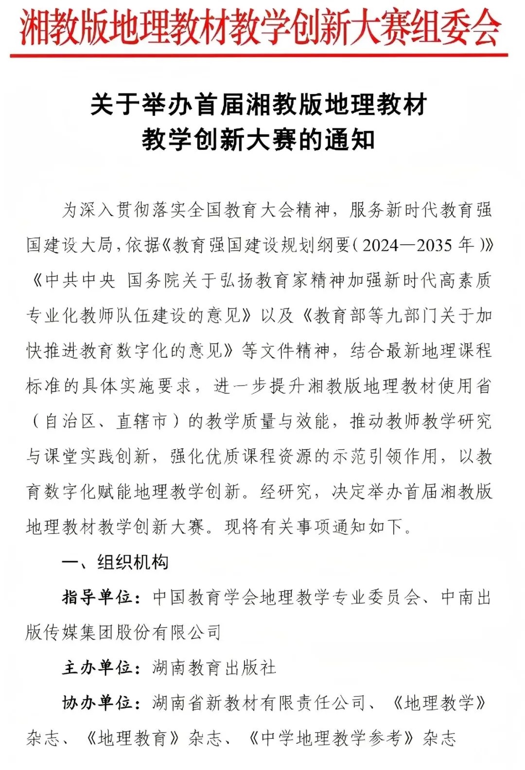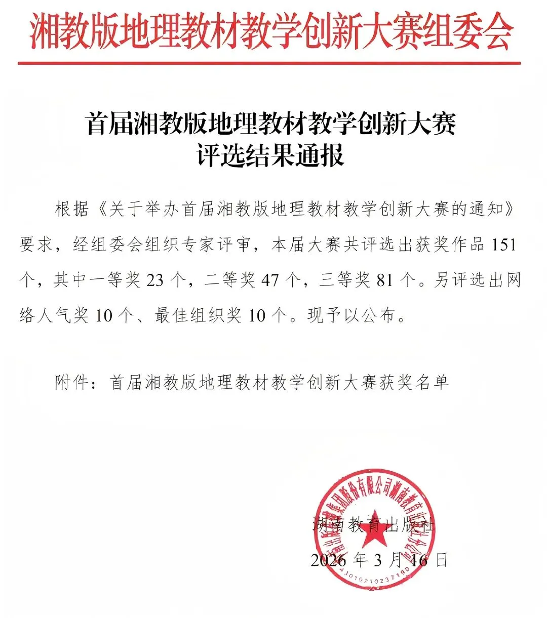 首届湘教版地理教材教学创新大赛由中国教育协会地理教学专业委员会、中南出版传媒集团有限公司指导,湖南教育出版社主办,湖南省新教材有限责任公司、《地理教学》杂志、《地理教育》杂志、《中学地理教学参考》杂志协办。全国各省、直辖市、自治区参赛选手踊跃参与。组委会严格遵循公平、公正、公开原则,组织专家开展专业评审,最终评选出获奖作品151个,其中一等奖23个、二等奖47个、三等奖81个。另评选出网络人气奖10个、最佳组织奖10个。