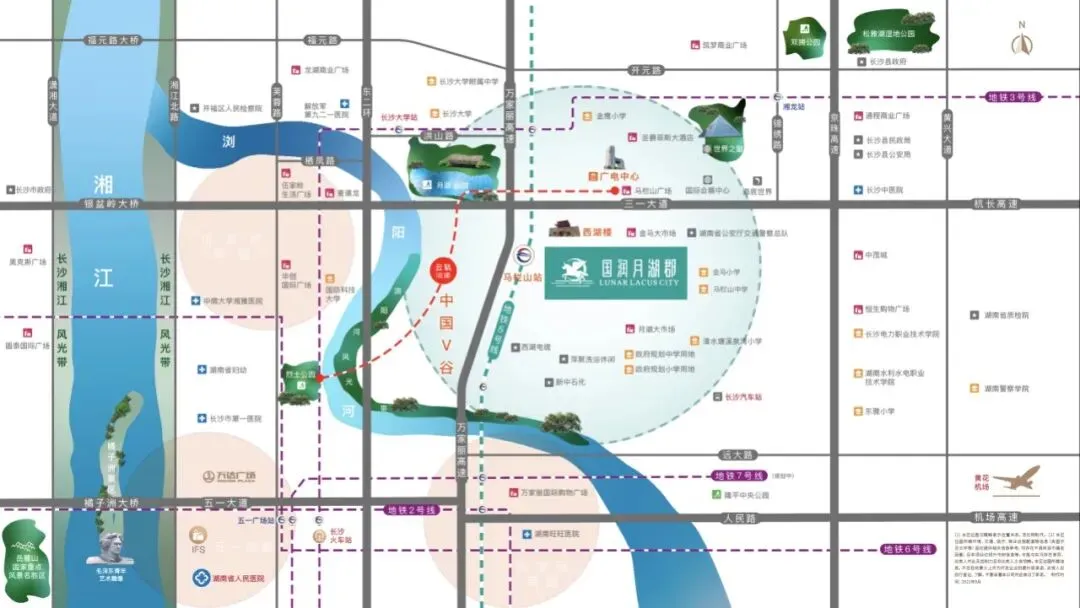 •广电中心(约600米):项目对面即湖南广电中心,近距离体验潮流与娱乐的前沿生活领地。