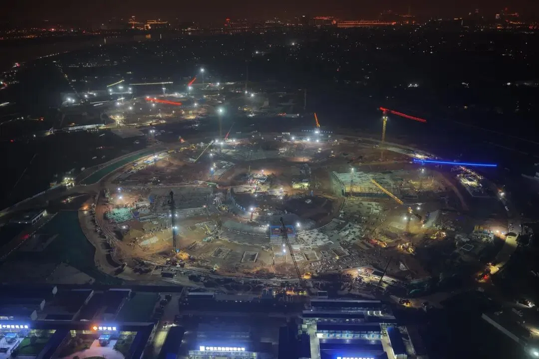 记者走进施工现场,成片的结构墙板、结构梁交错分布,数十台塔吊的长臂在空中有序吊装转动,混凝土搅拌车、泵车、吊车等工程设备有序配合运转,支模架搭设、模板铺设、钢筋绑扎、混凝土浇筑等工序穿插推进。项目采用环形放射状布局,多个功能场馆围绕核心区域展开,流畅的弧线轮廓勾勒出未来场馆的整体形态,蓝色防护脚手架与红色模板覆盖在部分场馆顶部,展现出蓬勃的建设活力。