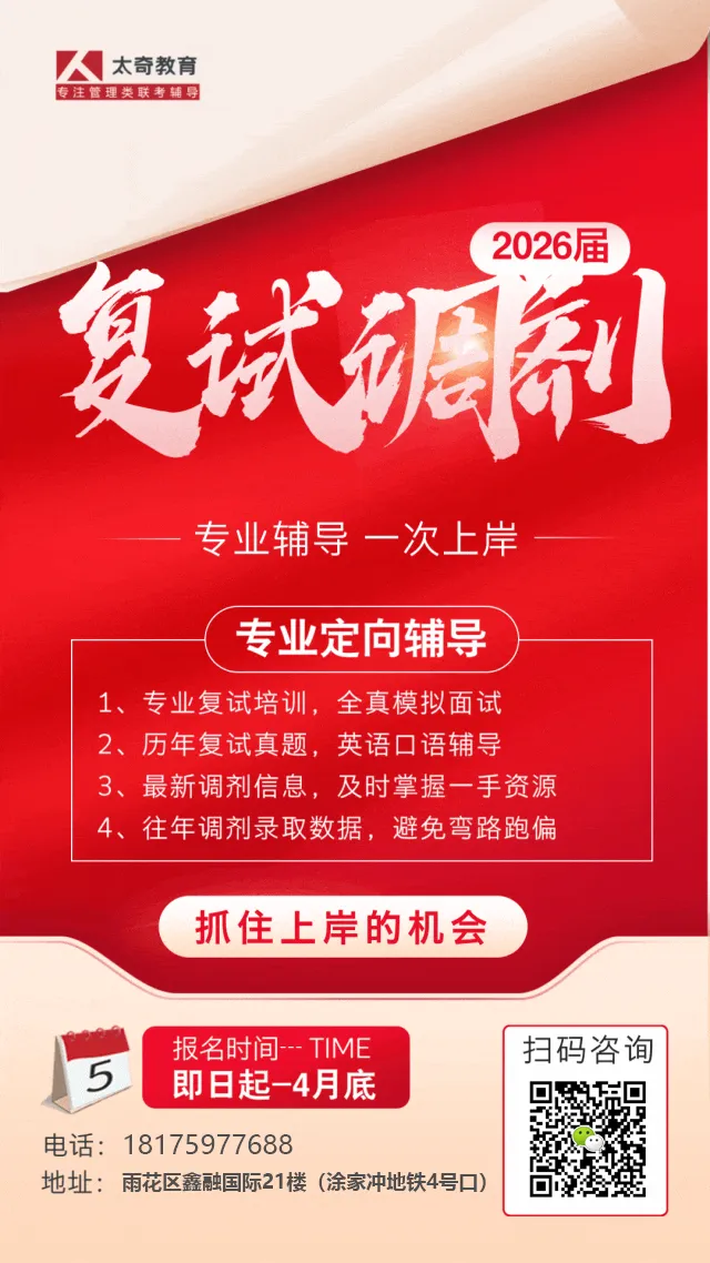如果你的成绩在国家线A/B线,但是一志愿不保险,请速联系长沙太奇考研老师。调剂录取班火热招生中,想要一次上岸的考生,欢迎大家咨询我们太奇老师们~请多多关注长沙太奇教育哦~